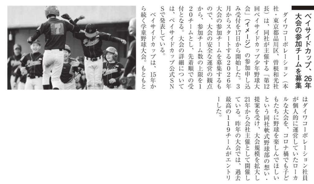 2026 年1月20日発行のカーゴニュースにて、「第12回ベイサイドカップ少年野球大会2026」についての記事が掲載されました。