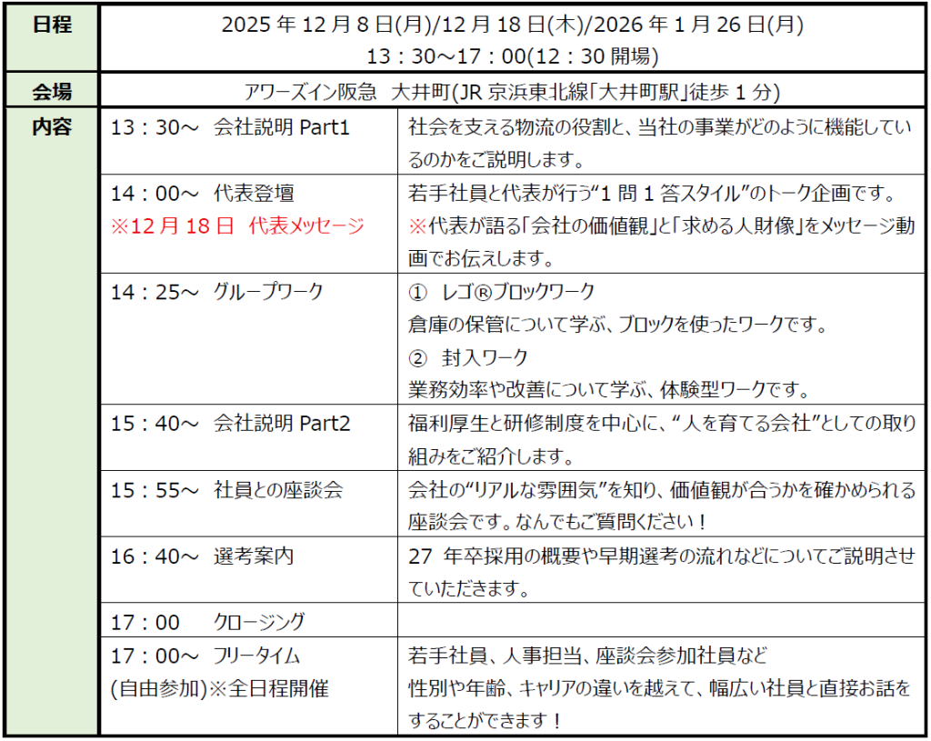 当日は、実際の業務をイメージできる体験型グループワークと、現場で働く社員との座談会を中心に構成。倉庫業の役割や働き方を自分ごととして理解できるプログラムとなっています。さらに、12月8日(月)と1月26日(月)には代表の曽根和光も登壇し、当社が大切にしてきた仕事観や求める人財についてお話しします。