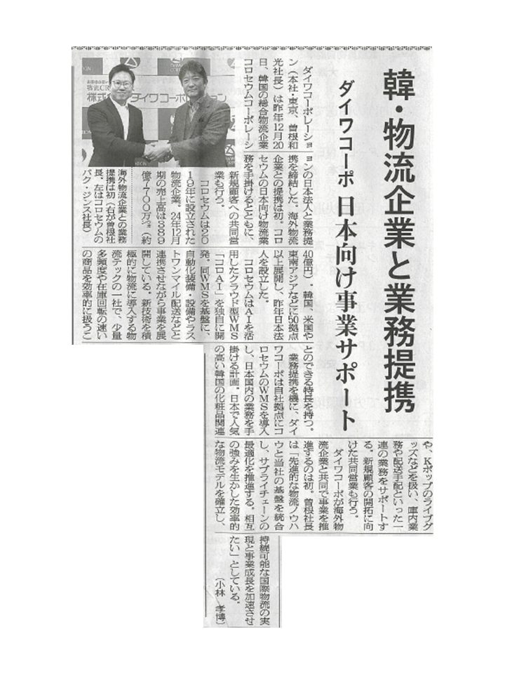 2026年1月27日発行の輸送経済新聞に「日韓物流で業務提携」について記事が掲載されました。